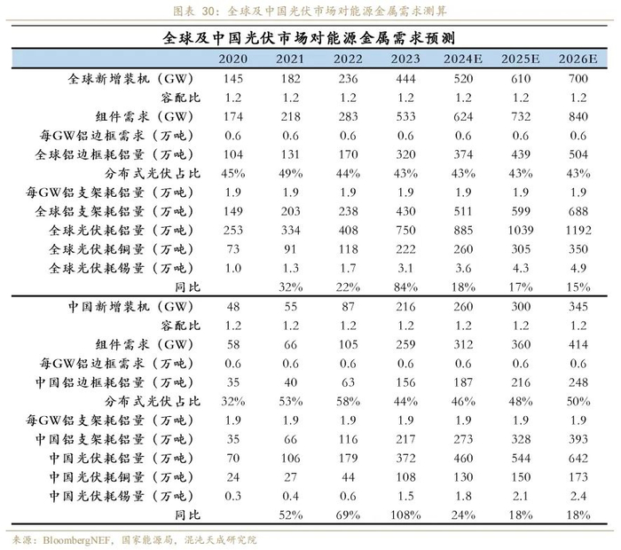 光伏用铝主要在边框和支架两项上。每GW光伏边框的耗铝量大约在0.6万吨,根据CPIA发布的《中国光伏产业发展路线图》目前在光伏组件领域铝合金边框的市占率达到95%,是光伏边框的最常用材料,中短期内暂无替代可能,将较长时间维持较高的市场占有率。铝合金边框根据不同尺寸硅片生产的光伏组件,单GW耗用的铝合金边框也不同,210mm组件耗用铝型材0.6万吨,182mm组件耗用铝型材0.59万吨,166mm及以下尺寸组件耗用铝型材0.61万吨,我们取每GW0.6万吨去测算耗铝量。铝合金支架更多的应用在分布式光伏电站,根据测算,每GW分布式光伏电站所用支架耗铝量约为1.9万吨。光伏用铜主要应用在光伏焊带、连接器、电缆和逆变器等,根据Wood Mackenzie报告的数据,1GW光伏新增装机量需要消耗5000吨铜。光伏用锡主要在光伏焊带,通过光伏焊带连接的光伏电池片,在EVA胶膜、光伏玻璃、背膜、边框等材料封装后形成光伏组件,1GW光伏新增装机用锡量约为56-86吨,取中值在70吨/GW左右。我们按照2024年集中式光伏新增装机140GW,分布式光伏新增装机120GW去测算中国光伏行业能源金属需求。2024年海外光伏新增装机规模维持前文《从各国能源转型目标乐观看待光伏明年装机》中的预测。