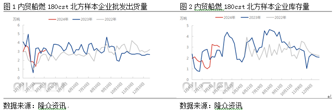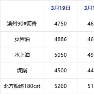 截至2024年3月19日,华北地区内贸船燃180cst批发单日议价5260元/吨,环比上涨80元/吨,涨幅1.54%,其混兑原料包括但不限于低硫渣油主料、页岩油、水上油及煤柴等,出厂价格环比上周上涨50-252元/吨不等,对船燃180cst混兑成本引导较强,推动批发议价出现上涨。