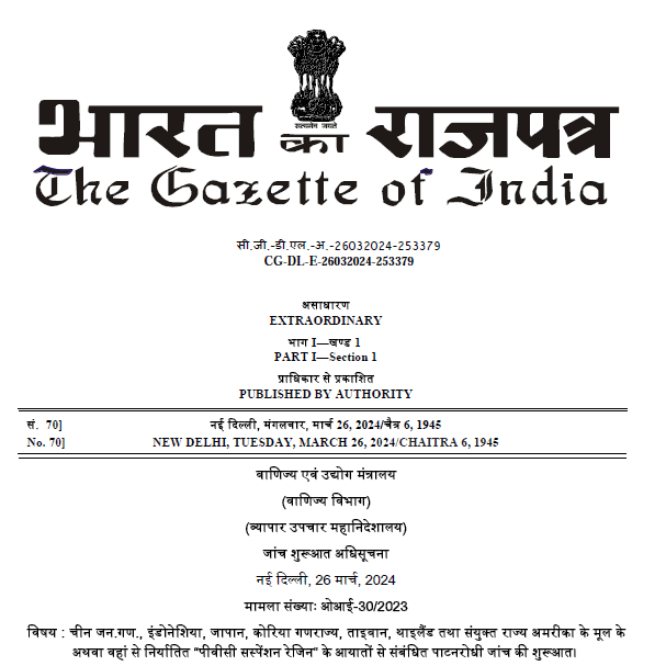 印度商业和工业部(商务部)3月26日通知对原产于中国、印尼、日本、韩国、中国台湾、泰国和美国的PVC进口启动反倾销调查。2022 年 10 月 1 日至 2023 年 9 月 30 日为此次调查期。