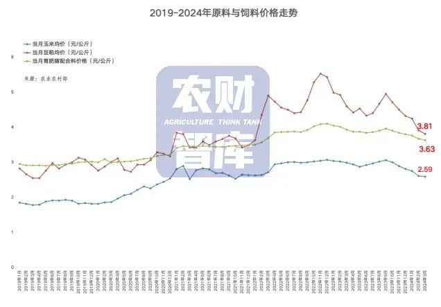 根据农业农村部数据,2023年四季度以来,玉米、豆粕、育肥猪配合料价格持续下调。2024年3月第二周,玉米下调至2.59元/公斤,豆粕下调至3.81元/公斤,育肥猪配合料下调至3.63元/公斤。