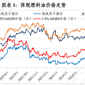 2024年3月,国际原油价格呈现先稳后涨态势。3月上旬巴以局势的紧张气氛仍未缓和带来利好支撑,但OPEC+减产延期带来的利好被市场提前消化,空好交织下国际油价趋稳运行;中下旬国际能源署上调全球原油需求预测,美国燃油需求转好,叠加俄罗斯炼厂遭遇乌克兰无人机袭击引发供应紧张担忧,国际油价显著上涨。燃料油方面,燃料油价格跟随原油价格波动,月底燃料油价格走强。截至2024年3月29日,低硫卖方报价为4613元/吨(650.18美元/吨),月环比上涨2.60%;高硫卖方报价为3526元/吨(496.97美元/吨),月环比上涨10.74%。