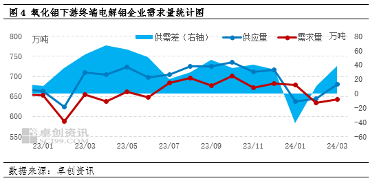 电解铝是氧化铝最主要的下游产业,用于生产电解铝的氧化铝消费量占比达95%左右。一般情况下,生产1吨电解铝需要消耗1.93-1.98吨氧化铝。监测氧化铝的下游需求可以监测电解铝厂的产出情况,通过对比过去几年氧化铝产品供需差的历史数据来看,绝大多数时间供需差为正值,氧化铝行业供过于求的局面已成为常态。不过,从卓创资讯数据监测来看,2024年1月氧化铝需求量为679.50万吨,供需差为-41.22万吨,近2年来供需差首次变为负值,表明1月份尚有41.22万吨的供应缺口,加上1月份多数下游终端企业存在节前适量补库的情况,也是推动氧化铝价格在1-2月份上涨的主要因素之一。
