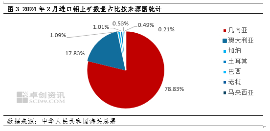 我国是世界上最大的铝生产国及消费国,近年来对于进口铝土矿的依赖度不断提升。我国铝土矿进口来源国主要是几内亚和澳大利亚,2024年2月份几内亚进口量为889.03万吨,环比减少4.26%,进口量占总进口量的78.83%,作为铝土矿进口第一大贸易伙伴,市场对于几内亚2023年12月的中央油库事件,以及2024年2月的停工事件的后续影响均较为关注。目前来看,尽管几内亚油库事件、停工事件暂未对该国铝土矿的开采、出口产生实质性的影响,但不稳定事件的频发,引发国内市场对于进口铝土矿供应紧缺的担忧,进口铝土矿价格上涨明显,推升了我国氧化铝产出成本,这也是1月、2月氧化铝价格不断上涨的因素之一。