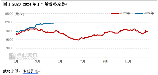 导语:一季度国内丁二烯市场价格强势拉涨,国内丁二烯供应减少加上货源集中出口,对市场气氛提振明显,价格涨至近两年高位。然由于国内下游需求跟进有限,进入3月份市场维持高位震荡趋势,市场持续上行稍显乏力。后期来看,下游产品价格预期跟进有限,加上供应端利好逐渐转弱下,丁二烯价格或续涨乏力,二季度或存在一定下行空间。