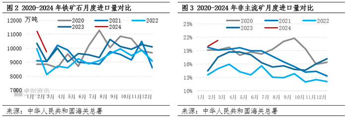 海关总署数据显示,1-2月中国累计进口铁矿砂及其精矿20945.2万吨,同比增长8.1%,高于近五年同期,其中1月份进口量达到往年历史同期新高11194.34万吨,单月进口量仅低于2020年7月11251.21万吨,处于历史次新高,而非主流矿增量也较明显,同比增幅达到39.8%。非主流矿的增加,一方面来自于高矿价的驱动,另一方面也受供应国家出口关税政策的变动及地缘政治影响等,后期供应量仍或有小幅抬升。