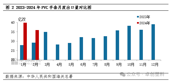 2024年一季度PVC手套制品出口较好,根据中华人民共和国海关数据显示,2024年1-2月PVC手套出口量在75.74亿双,同比2023年同期增加32.91%,较2023年11-12月出口量增加0.71%。自2023年四季度PVC手套制品海外需求增加,主要是因为海外手套制品库存下降,海外市场补货需求增加,带动PVC手套制品出口需求增量明显。据了解,因夏季手套制品更换频率增加,海外市场提前备货,所以2024年3月份手套制品海外需求仍维持向好,预计整体一季度PVC手套出口量维持高位,支撑手套料需求。