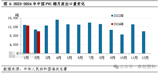 根据中华人民共和国海关总署数据显示,2024年1-2月PVC糊出口量在2.26万吨,较去年同期减少4.12%,较2023年11-12月减少2.10%。出口量减少一方面是因为2月春节假期影响,另一方面出口至欧洲方向货源结算周期拉长,影响当月出口量。据了解,3月份出口至欧洲方向货源或将继续减少,且该情况将会持续一段时间。受此影响,华东某乙烯法PVC糊企业3月出口量减量明显,企业库存及内销压力增加。