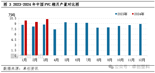 相较去年同期来看,2024年一季度PVC糊产量增幅高达12.28%,一季度PVC糊总产量在29.55万吨。行业开工负荷率72.41%,较去年同期提升8.9个百分点。虽然行业开工负荷率维持偏高,但1-2月份大部分企业库存无忧,原因在于春节前期部分PVC糊企业预售订单接单理想,一方面是手套料需求支撑,另一方面春节前大盘料下游制品企业节前补货需求较好。但进入3月份市场大盘料需求恢复不及预期,部分下游制品行业如皮革、玩具等行业开工及订单偏弱,需求疲软,尤其乳液法PVC糊企业出货压力增加,价格下行幅度明显。微悬浮法PVC糊企业因手套料需求支撑,企业调整手套料与大盘料产出比,整体压力不大,价格降幅不及乳液法牌号。