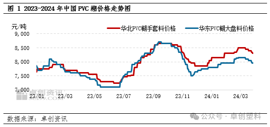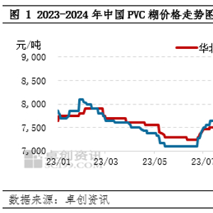 2024年一季度国内PVC糊价格呈先涨后跌走势,华东市场PVC糊大盘料均价7993元/吨,环比微涨0.01%,同比上涨2.65%;华北市场PVC糊大盘料均价8313元/吨,环比上涨1.77%,同比上涨6.98%。