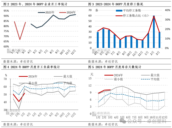 2024年二季度BOPP企业以调整生产结构、调整装置开停状态来平衡实际供应量的概率依旧较大。一季度数据来看,BOPP企业在2月集中停机检修(图2、图3)较多,3月已基本恢复正常运行状态,如若二季度需求增速慢于装置投产速度,不排除部分企业有继续调整装置开停状态的可能。此外,一季度BOPP企业开工负荷率处于历史五年同期偏低水平(图4),3月跌破历史五年同期低值,但3月BOPP企业装置已基本恢复正常水平。通过两个数据对比可以看出,企业不仅通过调整企业装置开停状态来平衡实际供应水平,也通过调整产品生产结构来降低装置负荷进行平衡(比如产品生产向薄膜、消光膜、热封膜转移等)。企业的实际开工及负荷水平将直接影响BOPP行业的实际供应量。