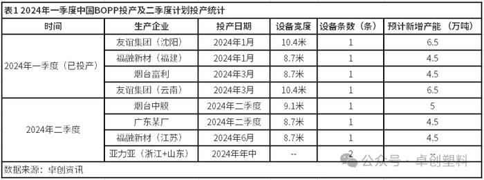 2024年二季度BOPP新增投产持续。据卓创资讯数据统计,一季度BOPP新增4条生产线,共涉及22万吨产能;截至2024年3月底,中国BOPP行业产能已达752.5万吨。二季度来看,仍有3条新线、2条旧线转让投产的计划(详见表1),预计新增产能达14万吨。BOPP行业新增投产密集,需密切关注行业开工负荷率及企业库存变化;行业实际供应量的变化将对BOPP价格产生影响。