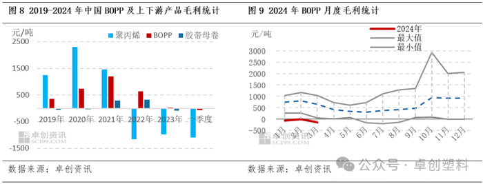 BOPP行业盈利已处于负值,将对底部价格形成支撑。据卓创资讯数据统计,2024年一季度BOPP行业毛利先增后降,多数时间处于负值(图9);纵观产业链条数据来看,上游原料聚丙烯与主要下游胶带母卷行业均处于亏损状态(图8),且上游聚丙烯亏损更加明显。负盈利现状或将对二季度BOPP低价形成一定支撑。