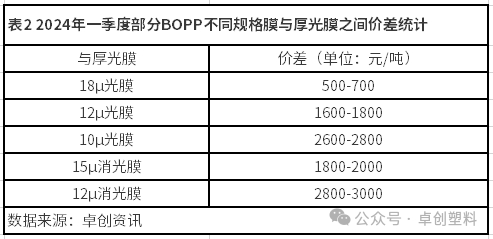 BOPP其他规格膜与厚光膜之间价差存收窄预期。据卓创资讯数据统计,2024年一季度BOPP各规格膜与厚光膜之间价差已有陆续收窄,目前各产品与厚光膜之间价差(表2)来看仍有一定商谈空间。如若二季度需求兑现相对缓慢,各规格膜与厚光膜之间价差存收窄预期。价差的调整也将会是BOPP行业景气度指标的表现之一。
