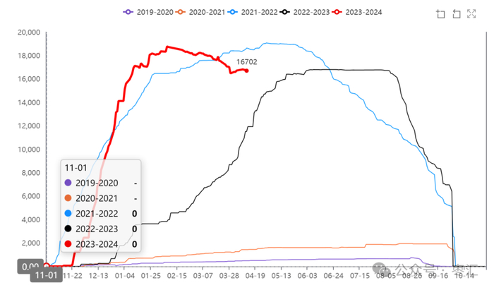 截至4月12日,目前仓单数16702张,折89775吨,本周盘面上涨,盘面与下游现货价仍倒挂。