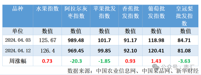 水果指数较上周相比小幅上涨;灰枣指数较上周下跌;香蕉批发指数较上周小幅上涨;苹果批发指数本周较上周小幅下跌;葡萄较上周小幅上涨、皇冠梨较上周下跌。
