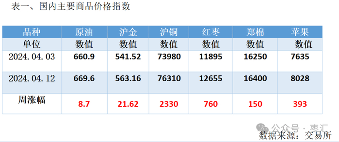 国内主要商品,原油上涨,沪金上涨,铜上涨,红枣上涨,棉花上涨,苹果下跌,商品多数上涨。