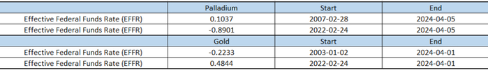 进一步考察2022年2月以来的情形发现,钯金与联邦基金实际利率(EFFR)之间的相关系数为-0.8901,相关关系逆转为显著的负相关关系。同一时期,黄金与联邦基金实际利率(EFFR)的相关系数为0.4844,相关关系逆转为较弱的正相关关系。这表明,最近两年钯金与黄金的市场表现出现根本背离。