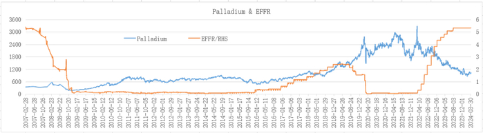 根据2007年-2024年间的数据计算发现,钯金与美元指数之间存在较弱的正相关关系,相关系数为0.5040;不过,最近两年的情况发生了一些变化,根据2022年2月-2024年4月期间的数据计算发现,钯金与美元指数之间的相关系数下降至0.0843,正相关关系大幅减弱,这与美联储政策有关。2022年以来,为应对严重的通胀威胁,美联储大幅加息、持续缩表,美元指数表现强势。