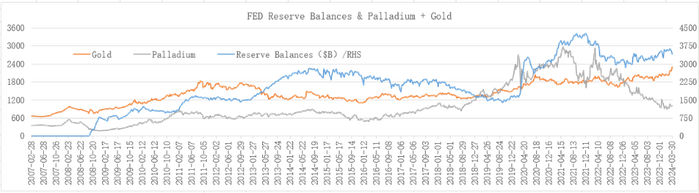 根据2007年以来的数据计算发现,钯金价格与美联储准备金规模之间存在一定的正相关关系,相关系数为0.6542,这一关系很容易理解。