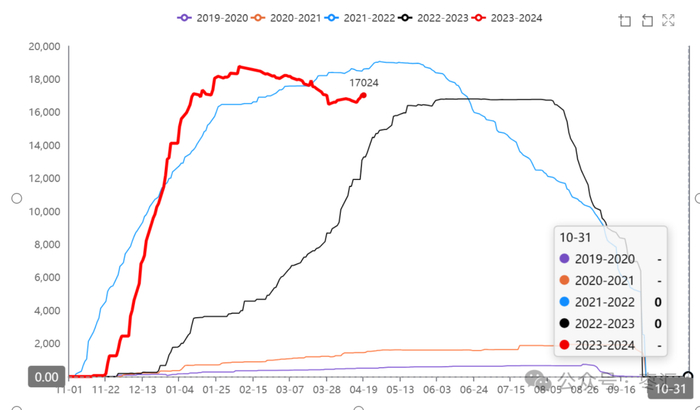 截至4月19日,目前仓单数17024张,折85120吨,本周盘面上涨,盘面与下游现货价仍倒挂。