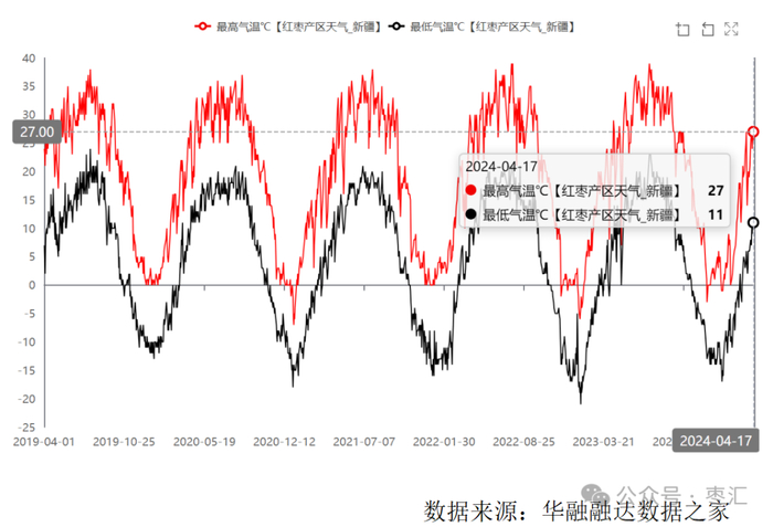 新季枣方面枣树处于萌芽阶段,去年因倒春寒影响气温偏低,使枣树生长发育推迟,今年目前来看未有大幅降温冻害天气。