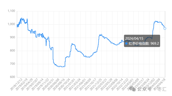 数据显示,截至4月18日,新华(阿拉尔)红枣价格指数报966.95点,周环比下跌0.26%,分地区看,新疆产区红枣价格指数周环比下跌1.30%,批发市场红枣价格指数周环比上涨0.29%。