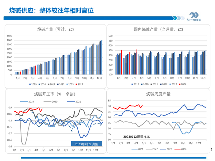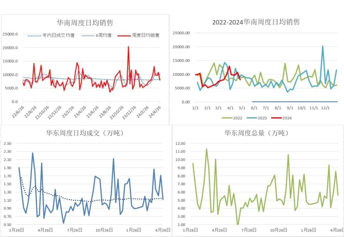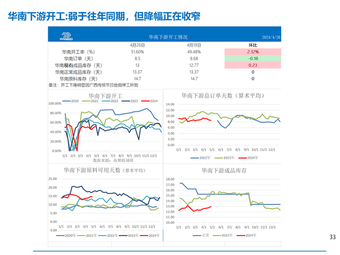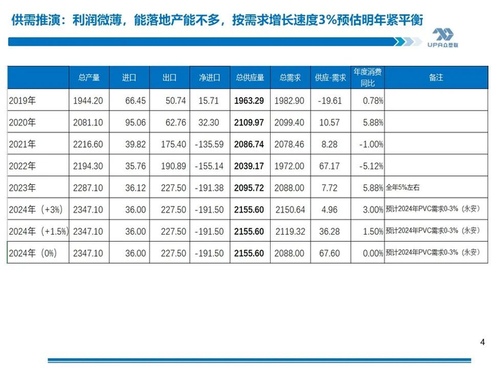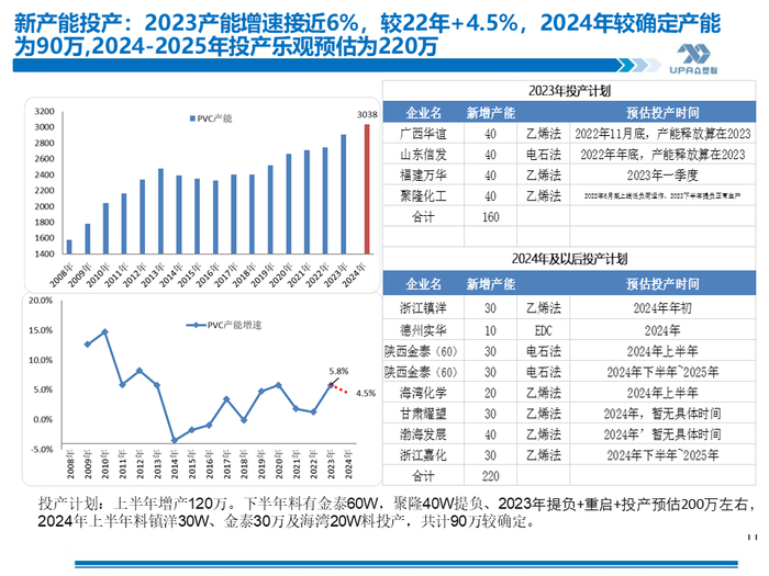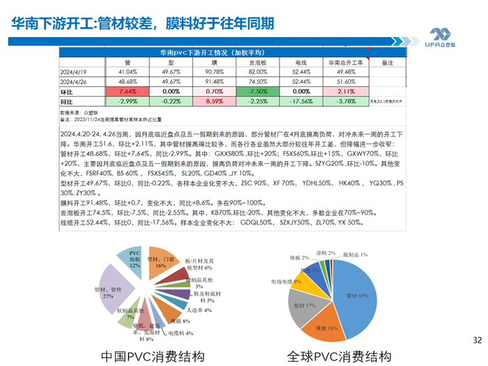 上游PVC开工: 截至4月25日当周,上游开工负荷小幅回升,本周PVC粉整体开工负荷率为74.36%,环比+3.02%。下周(4.25-5.2)预计上游开工率继续回升至78-79%左右,因检修装置陆续重启,新增检修装置在4月底5月初数量不多。 投产计划: 2023年信发40、华谊40、万华40投产,聚隆40W提负、中谷30万2023年11月上旬重启,共计近190万投产或重启。2024年~2025年全年可能投产220万吨产能,其中镇洋30W、金泰(计划60W)30万及海湾20W共计90万较确定。据了解,金泰30万将在5月份投产。镇洋一季度已试车出合格品。 众塑联调研华南下游需求: 4.13-4.19当周,随着广西地区传统节日放假的结束,华南下游开工负荷回升较明显。本期华南下游负荷49.48%,环比+3.95%,同比-6.17%,降幅继续收窄。当前华南膜料、发泡板开工好于往年同期,型材则略好于往年同期。 |