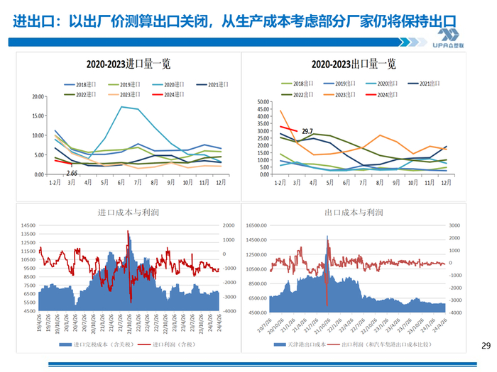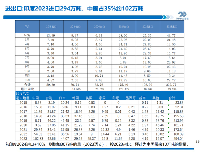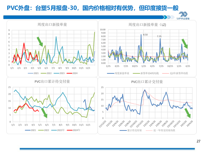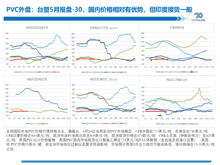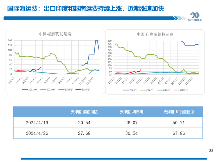 进口半闭,利润-1071;出口理论关闭,利润-2~-42(按上游出厂价5300测算,出口收入与出口成本西北货源出厂价+运至天津港运费进行比较)。电石法出价价在FOB700左右居多或更低,天津港电石法估价FOB700,环比-5, 出口收入5618,扣除出口杂费和运费,倒推内蒙出厂5258出口有优势,当前内蒙出厂价预计在5300~5350左右,出口暂时关闭。但从整体的生产利润考虑,部分上游会选择出口减轻内销压力。 4月19日当周出口新接单环比减量萎缩,在0.8-0.9左右,为较低水平(近一年均值1.7万,近二年均值1.9万 ) 国际海运费继续上涨且幅度较大。天津港至越南胡志明750~1000,海防700~850,蒙德拉1600~2200,那瓦舍瓦1600~2200。中国电石法出口印度FOB700+运费68=768,虽然较国际主流报价CFR800有优势,但因为运费的上涨FOB则压价较严重(台塑5月报盘-30,CFR印度800)。 印度9月1日实施BIS政策,考虑到期船,加上6-9月季风季节和9月后BIS政策的不确实性,预估当地进口商会在5月前后加大采购。印度2024年3月26日消息,当局要核查 2022 年 10 月 1 日至 2023 年 9 月 30 日这段时间中国是否有倾销的问题。 |