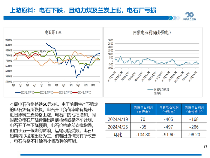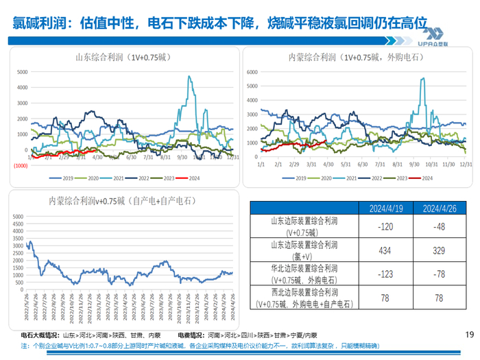 氯碱估值: 中等,液碱平稳片碱反弹,动力煤反弹,兰炭稳中小涨,电石平稳,电石法边际装置盈利:-48, 外购电石PVC成本(分摊0.47电解成本):山东6411;内蒙5314; 外购电石PVC利润:山东-911;内蒙36; 电石盈利:-244~-35(电石下跌,兰炭平稳) 山东边际装置综合利润:(0.75碱+1PVC)-48、(0.88液氯+碱):329(液氯); 华北边际装置综合利润(外购电石):-78(PVC+0.75片碱,但实际产业链较长,一般整体不发生亏损); 西北边际装置综合利润(非内蒙自产电石+外购电):78(PVC+0.75片碱),烧碱下跌; (23.11.17周调整利润公式,综合利润由0.7烧碱改为0.75烧碱) 西北宁夏PVC折盘面安全边际:5300(以当前烧碱、电石静态估算) |