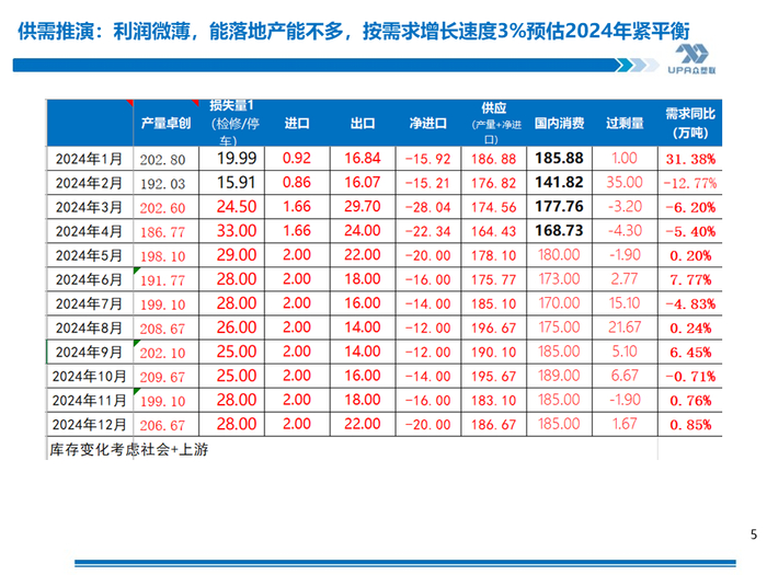 本周社会库存略降,上游降幅则较明显,表现为:上游降,华东微增,华南降,西南平。西南主要因因近期汽车发运相对便宜,部分铁运转汽运没入库导致部分地区库存下降。华南海运不及去年主要因万华和华谊的货源补充了华南市场,西北上游减少对华南消费地的发货(以下华东华南数据取自卓创)。 库存(华南+华东+西南)预估为57.63万吨,环比-0.3万吨,同比9.85万吨。 库存(华南+华东+西南+上游)预估为95.65万吨,环比-2.52万吨,同比6.02万吨。 |
