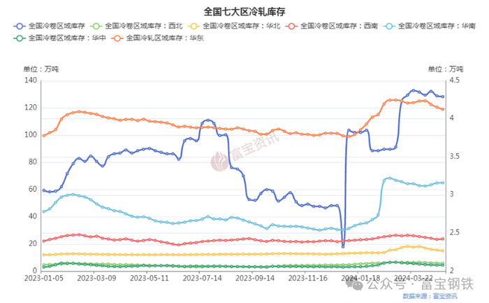 截止到4月底全国29个城市冷轧板卷库存变化:华东118.92万吨,较上周减少1.63万吨,华中4.42万吨,较上周减少0.03万吨,华南64.92万吨,较上周涨0.13万吨,西南23.74万吨,较上周涨0.35万吨,华北14.89万吨,较上周减少0.64万吨,西北5.8万吨,较上周减少0.18万吨,东北4.29万吨,较上周减少减少0.01万吨,全国(29城)236.98万吨,较上周减少2.01万吨。库存持续去化,当前市场供需关系有所改善,但压力仍存,贸易商对后市仍持谨慎心态。再加上成本支撑,冷轧价格上下两难。