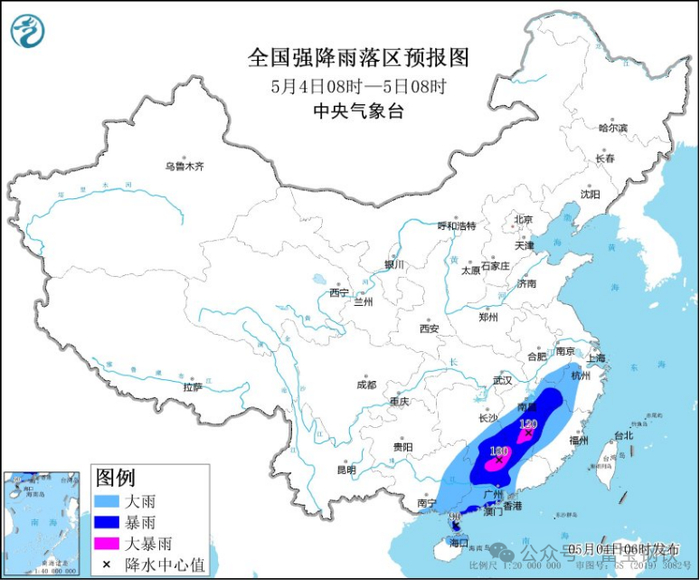 5月4日08时至5日08时,湖南东南部、江西大部、安徽东南部、浙江西部、福建西部、广西东部、广东中西部、海南岛北部等地有大到暴雨,其中,广东西北部、江西中部和南部等地的部分地区有大暴雨(100~180毫米)。上述部分地区伴有短时强降水(最大小时雨量40~60毫米,局地可超过70毫米),局地有雷暴大风或冰雹等强对流天气。
