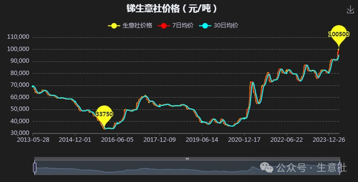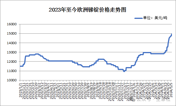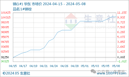 2024年4月中旬以来国内锑锭市场价格连续上涨,并在五一节后均价突破10万元大关,创近10年新高。