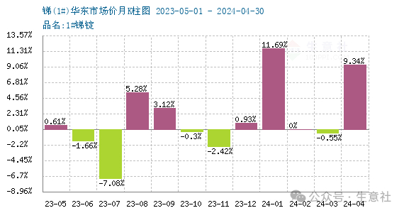 从生意社月K柱图可以看出,锑锭市场进入2024年以来整体上行,其中1月涨幅最大为11.69%,2月持平,3月微幅波动,4月上涨9.34%。