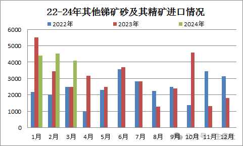 海关总署数据显示,2024年3月中国其他锑矿砂及其精矿进口量为4101.79吨,较2024年1月(4384.055吨)及2月(4516.438吨)的进口量小幅下滑。