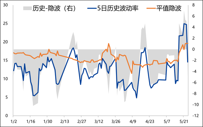 说明:最近一个交易日,5日历史波动率与20日的差值,5日历史波动率与隐含波动率的差值