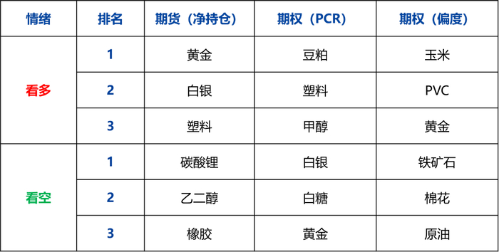看空情绪:期货上橡胶和乙二醇看空情绪加剧,期权上白银和黄金出现看空情绪。