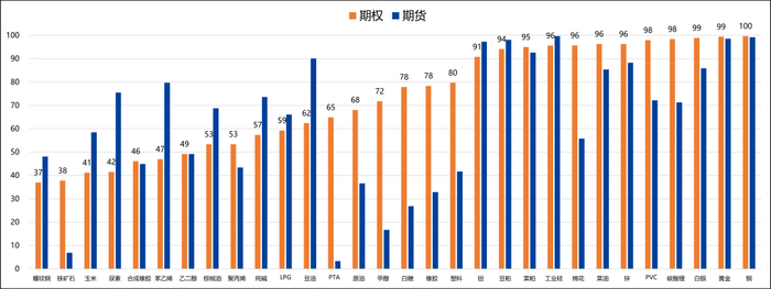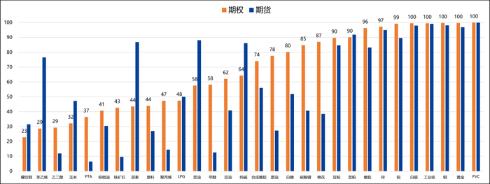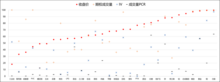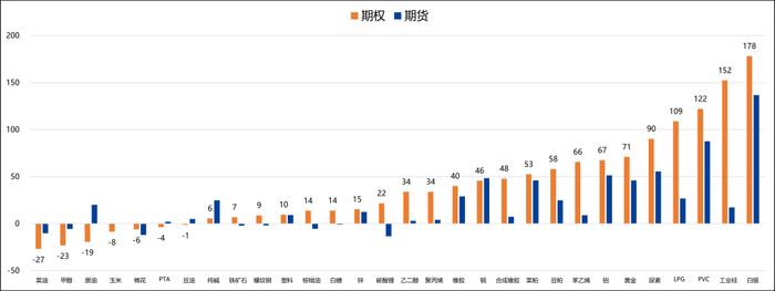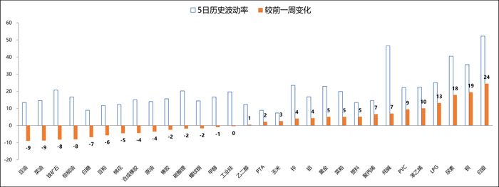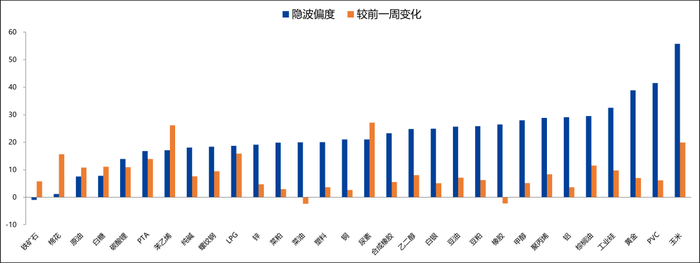 变化:白银、铜和尿素等品种的历史波动率上升超过105,此外多数期权品种的隐含波动率普遍上升。