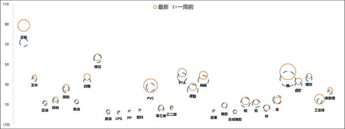 看多情绪:玉米、PVC和黄金,与前一周保持一致。
