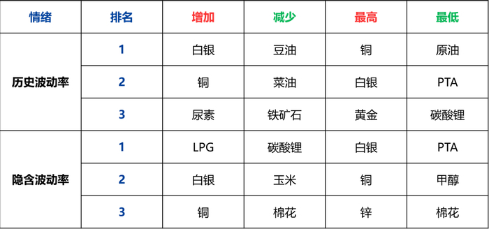 历史波动率上升前三品种为白银、铜和尿素 |