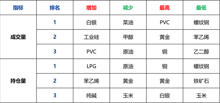 成交量增长幅度前三为 白银、工业硅和PVC |