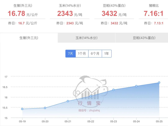 注:“红色字体表示涨或平、绿色字体表示跌”,数据来源于行情宝,生猪的价格为“元/kg”,玉米、豆粕价格单位为“元/t”,此价格为生猪成交价格,仅供参考
