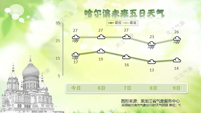 6日白天最高气温:大兴安岭、黑河北部、大庆、绥化、哈尔滨、佳木斯25℃~27℃,其它地区22℃~24℃。