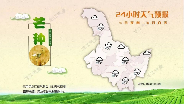 5日夜间到6日白天:大兴安岭北部、黑河东部、伊春北部、佳木斯东部多云,其它地区多云有阵雨或雷阵雨,其中鸡西、牡丹江局地有中雨。