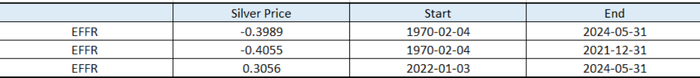 其中,1970-2019年间,联邦基金实际利率(EFFR)与白银价格之间的相关系数为-0.4055,但2020-2024年间相关系数变为0.3056,表明联邦基金利率与白银价格之间的相关关系发生逆转,由较弱的负相关关系变为较弱的正相关关系,原因与前文美债名义收益率的情形相似,不再重复介绍。