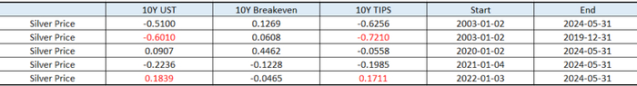名义利率变化对白银的影响体现在两个方面。以10年期美债名义收益率为例,假设其他条件不变,当10Y UST上涨,反映实体经济需求旺盛,利多白银;另一方面,持有贵金属的机会成本上升,利空白银。反之,当10Y UST下跌,表明实体经济需求下降,利空白银;同时,持有贵金属的成本下降,利多白银。这正是白银价格趋势与黄金不完全相同的关键原因。