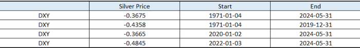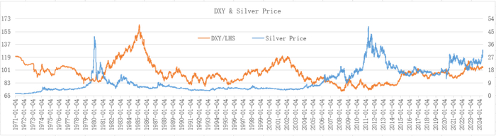 理论上,无论从工业属性还是从贵金属属性,白银价格都会因美元指数强势而承受压力,因美元指数弱势而获得支撑。根据1971年1月-2024年5月期间的数据计算发现,美元指数与白银价格之间的相关系数为-0.3675,呈较弱的负相关关系,前述分析得到验证。