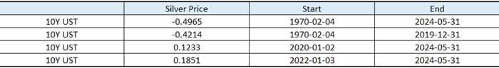 1970年以来的历史数据表明,10Y UST与白银价格之间存在较弱的负相关关系,相关系数为-0.4965,这一结果表明,白银的贵金属属性更显著,工业品属性较弱。