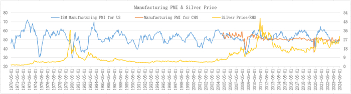分析白银的工业属性,可借助制造业PMI这个指标,本文选取美国ISM制造业PMI、中国官方制造业PMI两个指标作为研究对象。