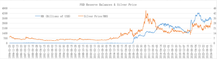 1984年1月-2024年5月期间,美联储准备金规模与白银价格之间的相关系数为0.7721,呈较为显著的正相关关系,流动性充裕对一切资产价格的支撑都是显而易见的。